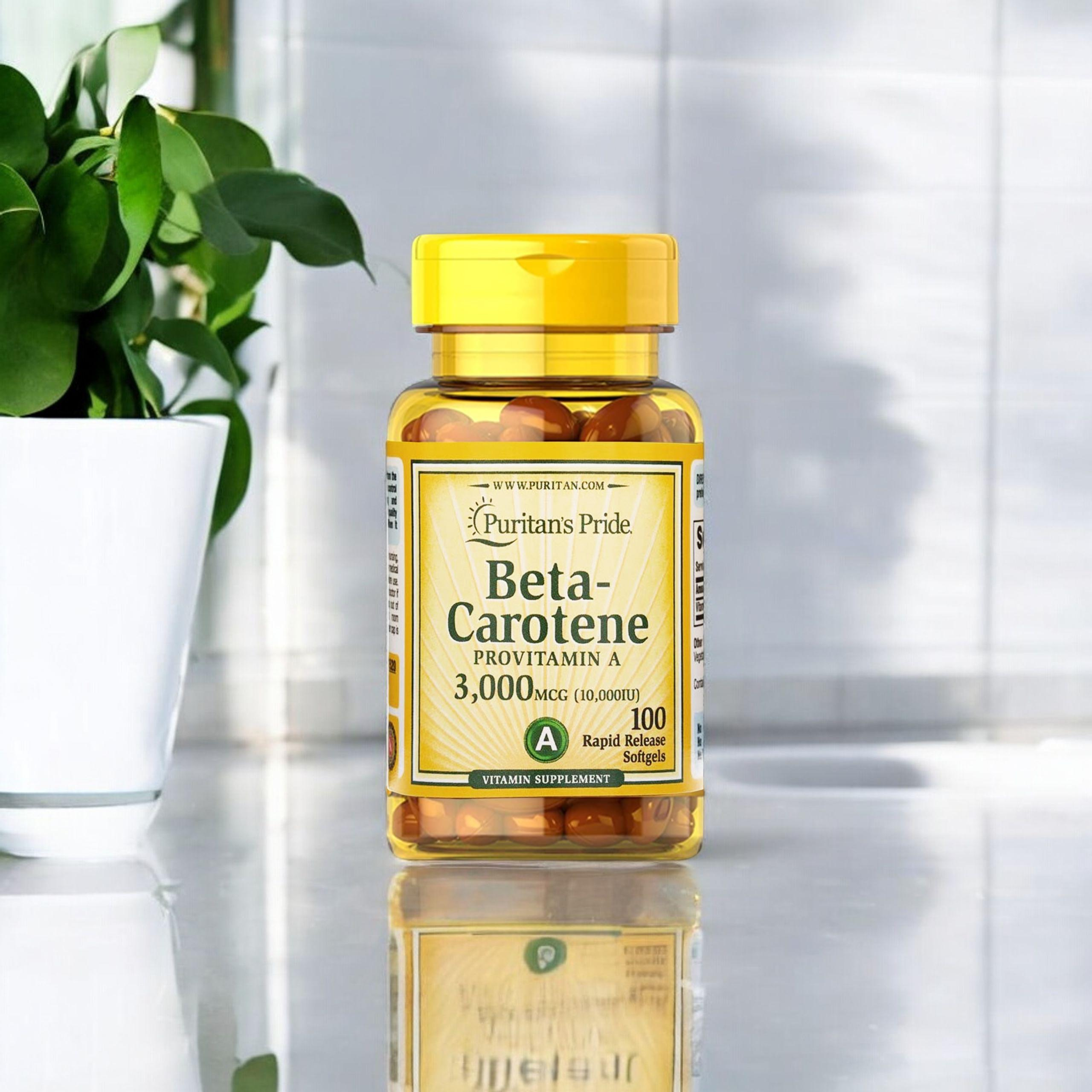 - Le bêta-carotène de Puritan's Pride contient 10000 unités de cette précieuse substance par portion, enfermée dans des capsules molles en gel. Le bêta-carotène accélère le bronzage et donne à la peau une belle teinte. Dans le corps, il est converti en vita