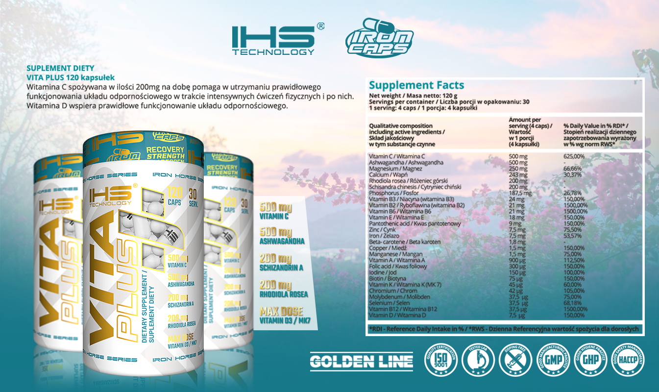 • Vita Plus de IRON HORSE est un complexe de haute qualité de vitamines, minéraux et extraits végétaux. Contient une forte dose de vitamine D, d'ashwagandha, de rhodiola et de schisandra chinensis. Le produit dispose de certificats de qualité, de sécurité e