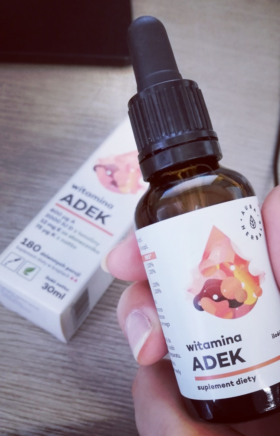 - A.D.E.K. par Aura Herbals est un complexe de quatre vitamines liposolubles importantes pour l'organisme. Le produit contient de l'huile d'olive, ce qui permet à ces vitamines d'être absorbées directement dans la circulation sanguine, sans surcharger le sy