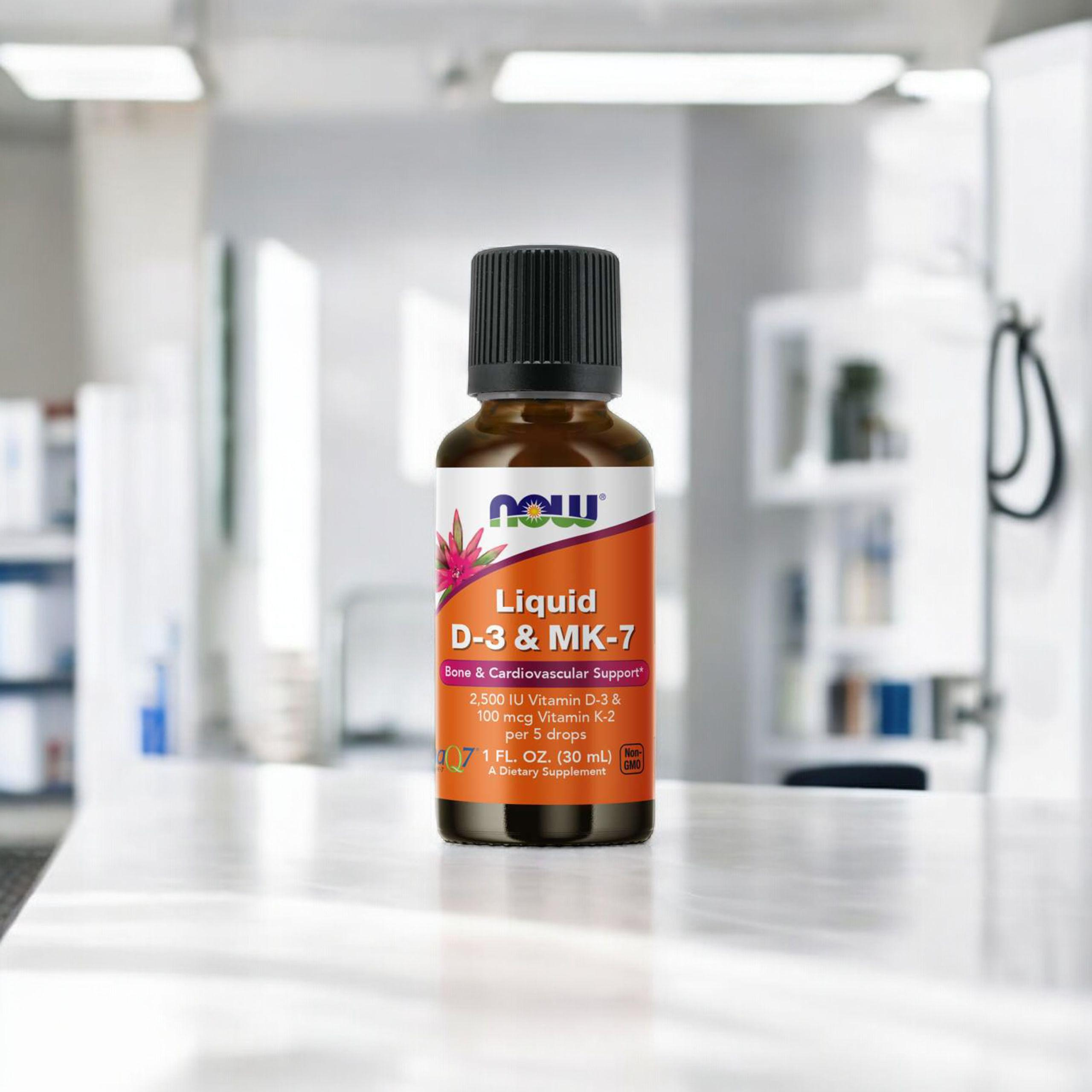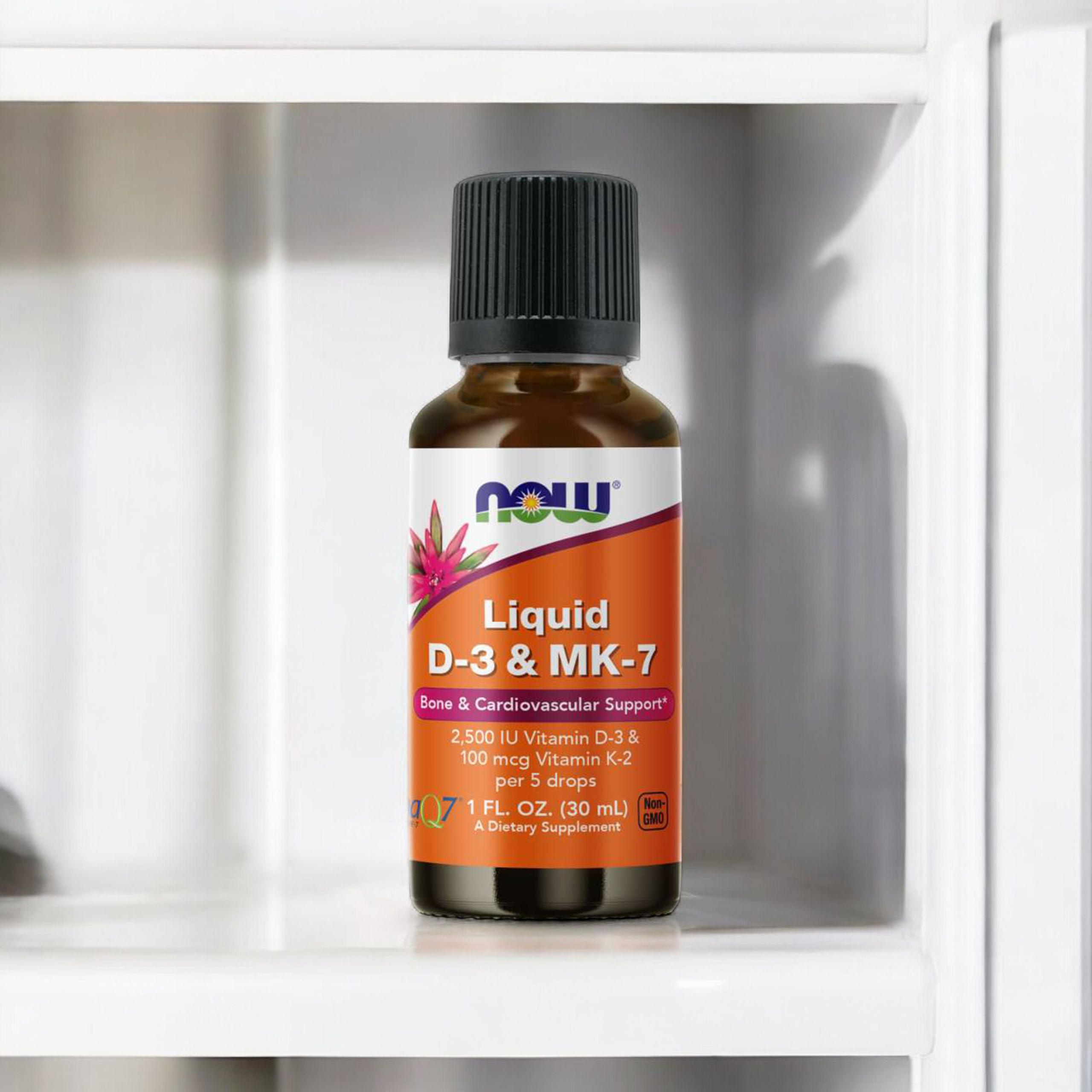 - Le complément alimentaire NOW contient des vitamines D3 et K2 MK7 dissoutes dans de l'huile MCT, ce qui assure la meilleure absorption. C'est un produit sous forme pratique de gouttes facilitant la supplémentation. Il soutient l'immunité ainsi que des os