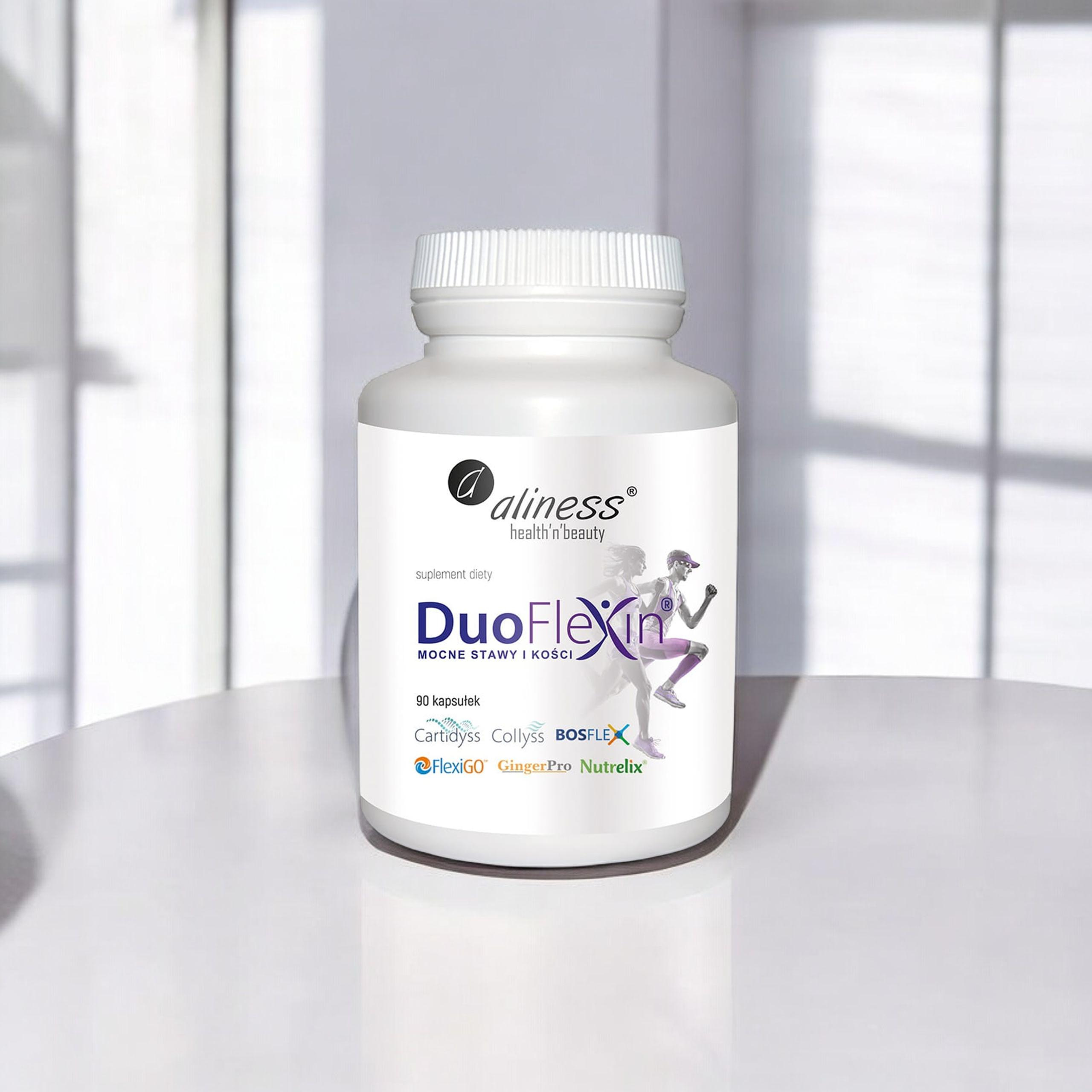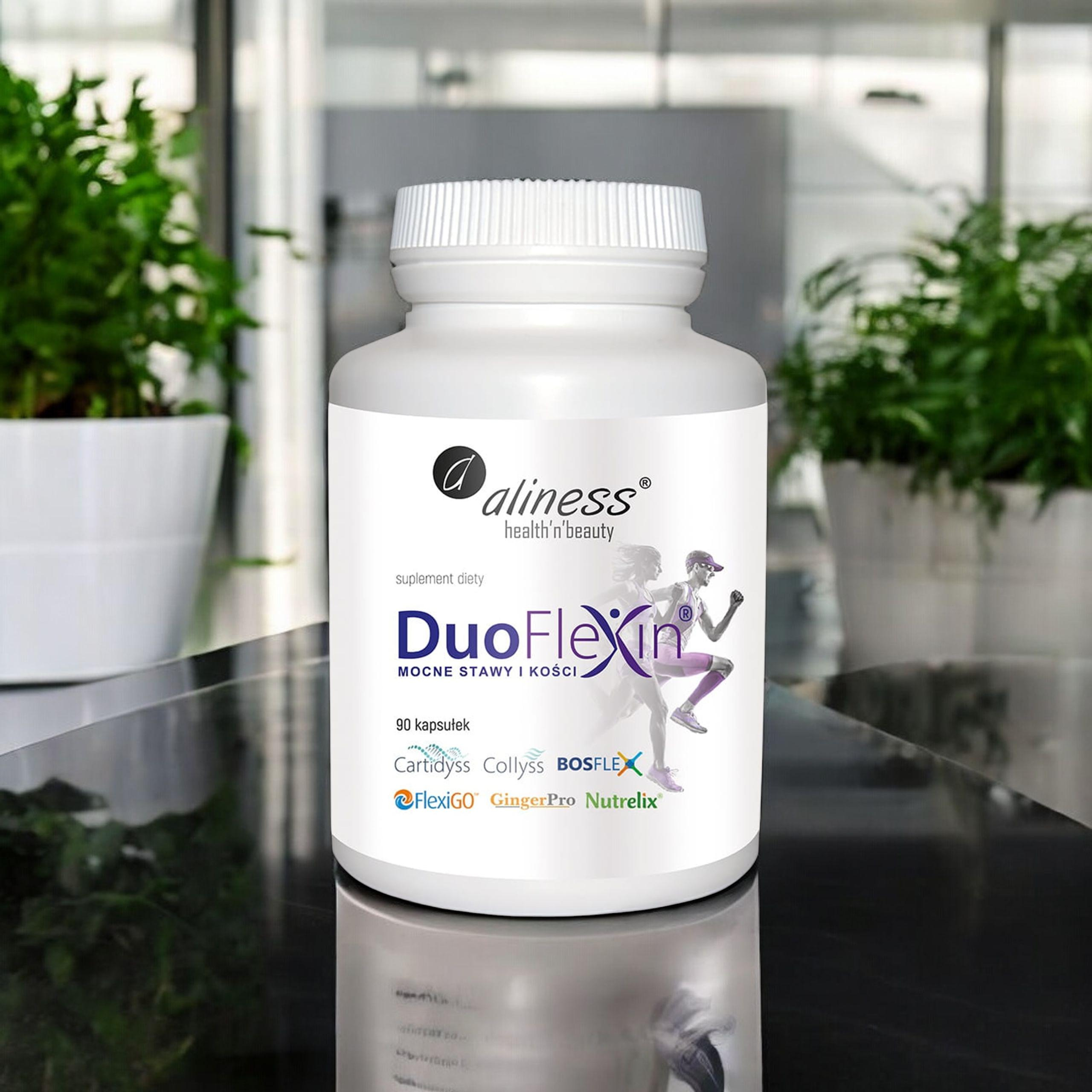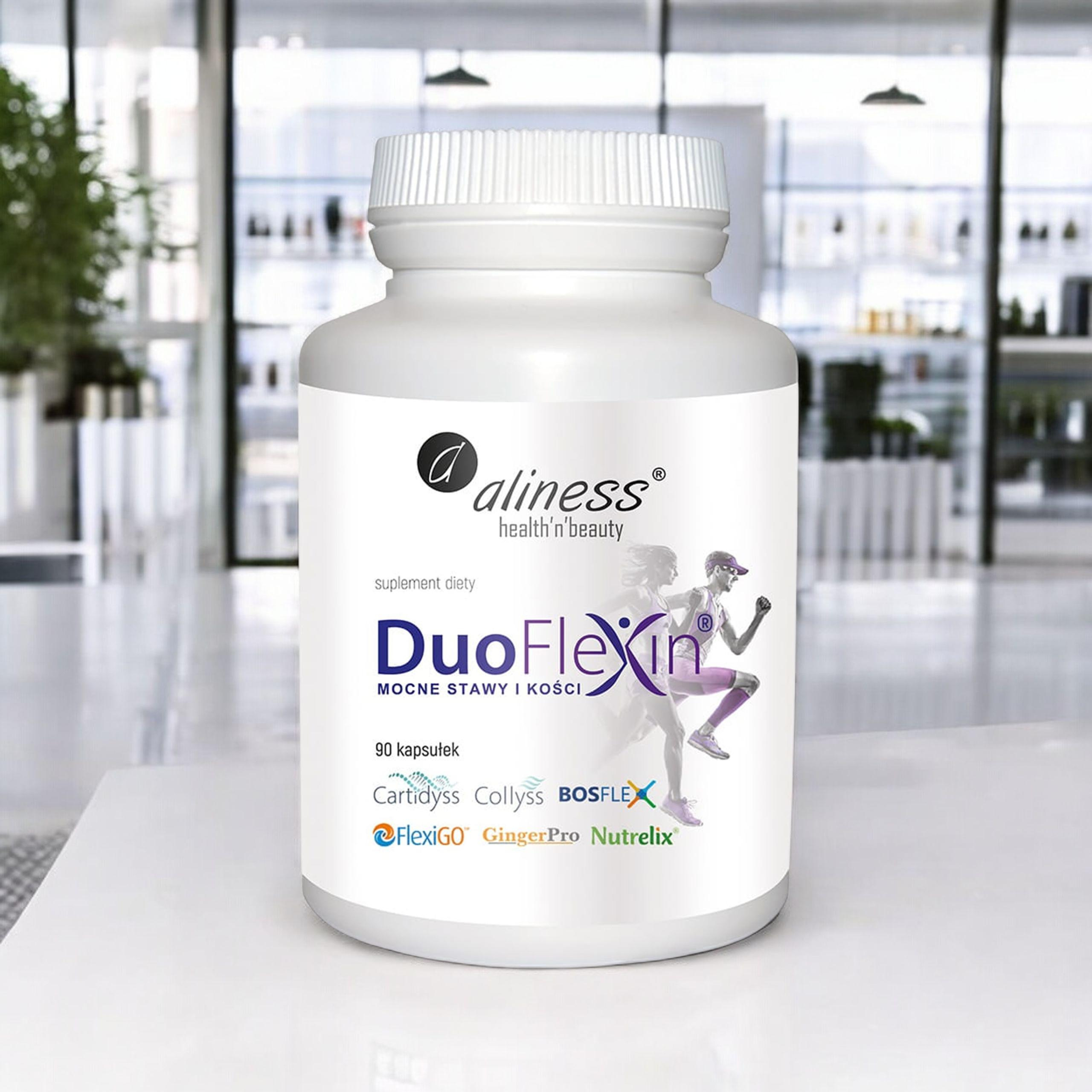 - DuoFlexin de Aliness est un complément alimentaire qui renforce le système osseux et articulaire grâce à deux types de collagène, de la vitamine C provenant de l'acérola et des extraits de Boswellia, de griffe du diable et de gingembre. Prenez soin de vos
