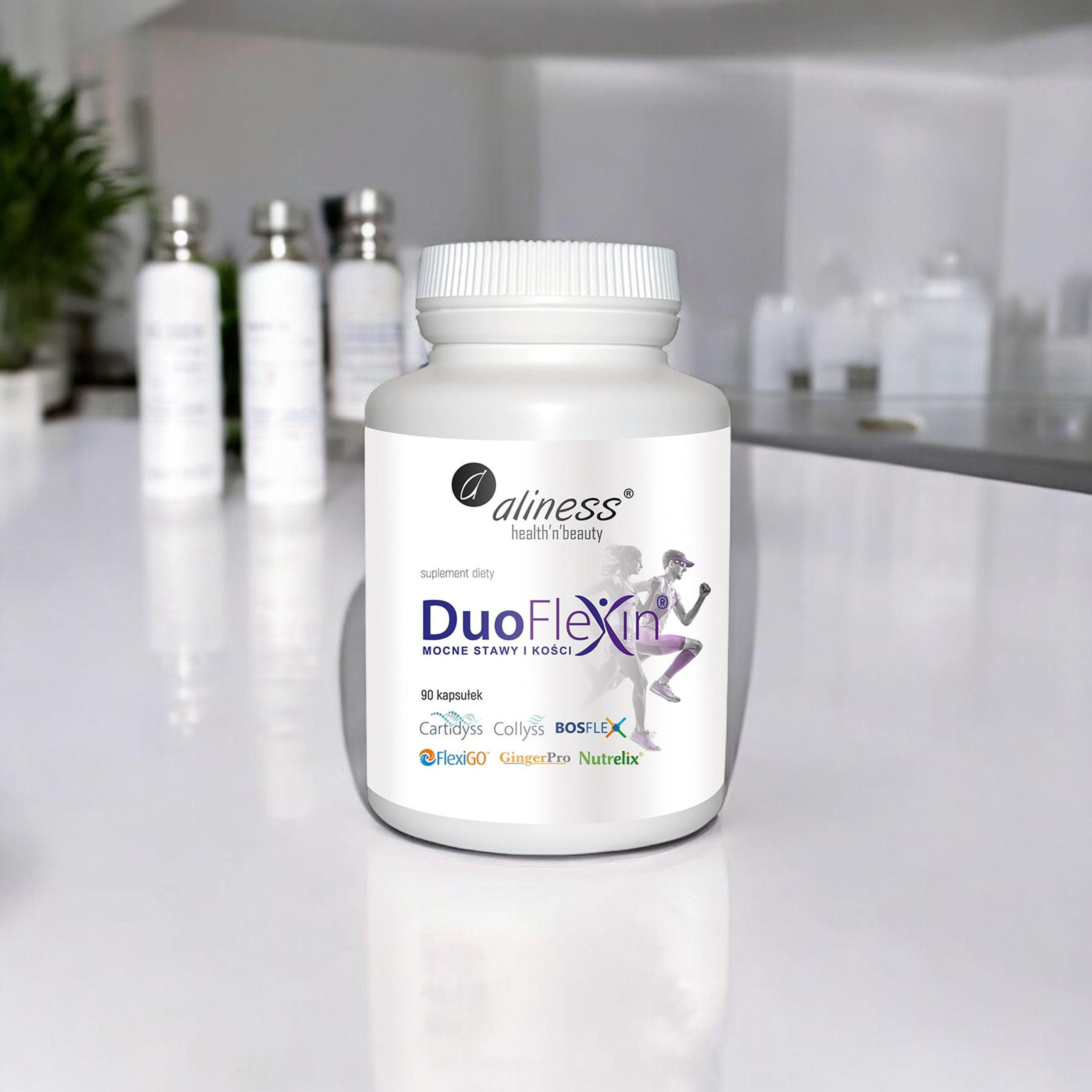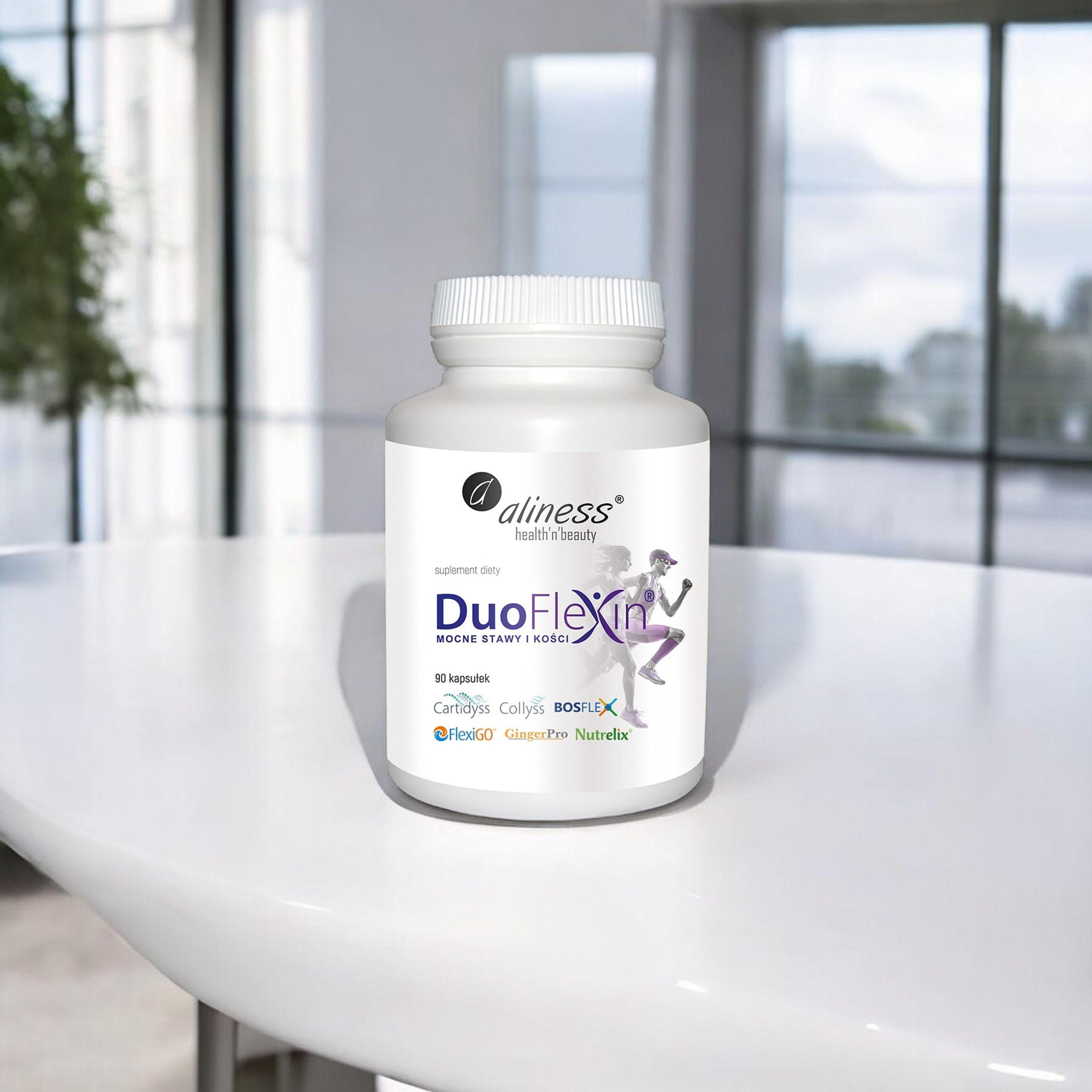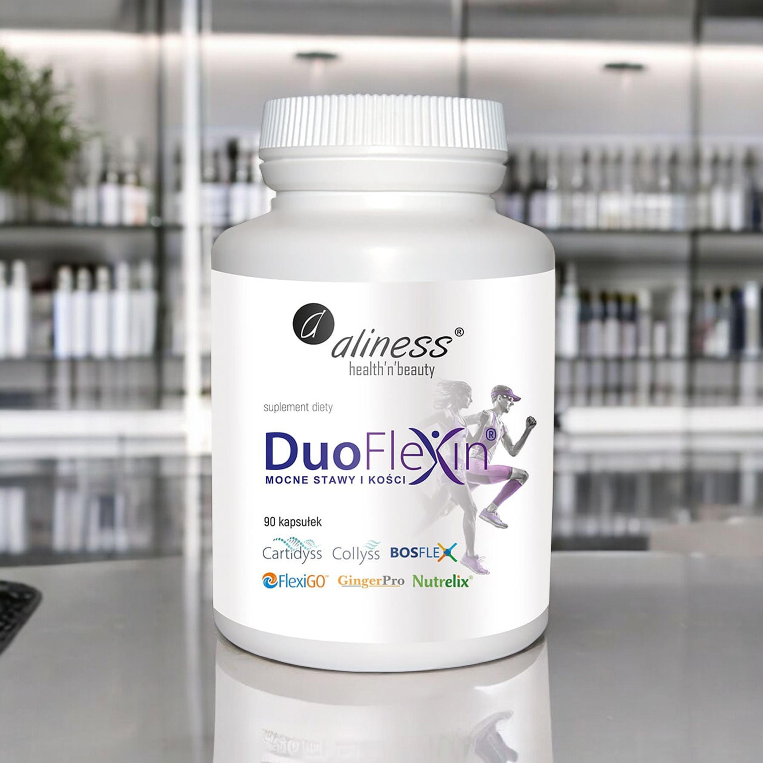 - DuoFlexin de Aliness est un complément alimentaire qui renforce le système osseux et articulaire grâce à deux types de collagène, de la vitamine C provenant de l'acérola et des extraits de Boswellia, de griffe du diable et de gingembre. Prenez soin de vos