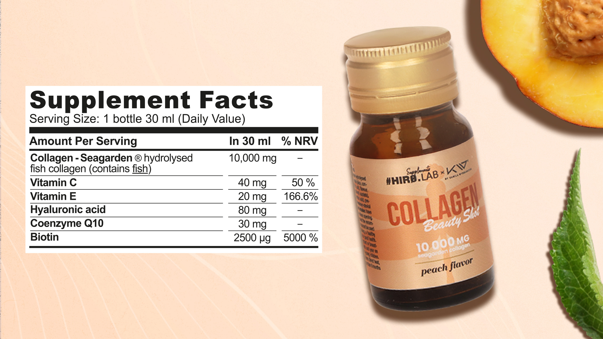 Chez HIRO.LAB, nous mettons l'accent sur la qualité et l'assimilation – c'est pourquoi le collagène marin hydrolysé Seagarden® utilisé dans ce produit est un ingrédient de qualité premium, issu de Norvège dans un procédé avancé d'hydrolyse enzymatique des protéines en peptides biodisponibles. Ainsi, l'organisme peut les utiliser efficacement comme matériau de construction pour les tissus conjonctifs, notamment la peau. Le shot est à forme liquide, ce qui élimine le besoin de digérer des gélules ou comprimés – les ingrédients sont prêts à être absorbés presque immédiatement. L'ajout de jus de fruits naturels, la saveur pêche et le flacon compact font de la supplémentation non seulement une démarche efficace, mais aussi agréable. Le produit ne contient ni gluten, ni lactose, ni agents épaississants artificiels, et sa formulation a été pensée pour la pureté et la fonctionnalité. La qualité est attestée par les normes GMP et HACCP – chaque lot subit un contrôle rigoureux.