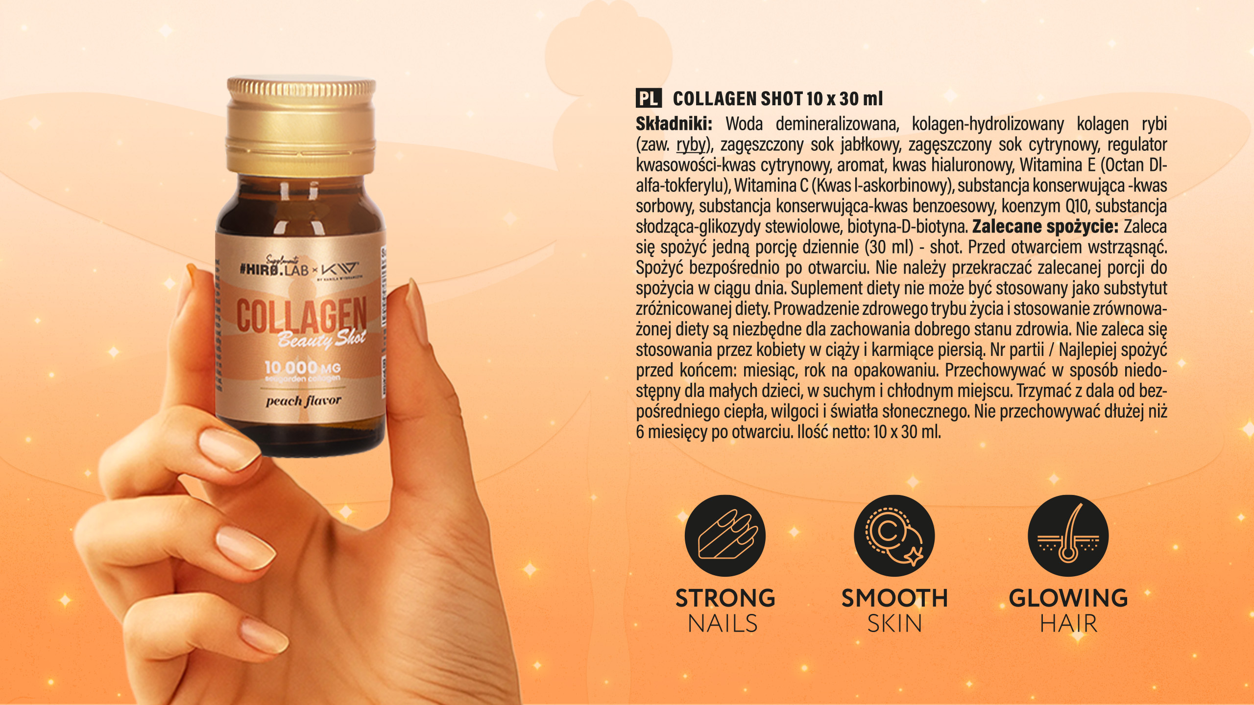 Pour les femmes constatant une perte de fermeté de la peau : la teneur de 10 000 mg de collagène de type I par portion soutient la structure de la peau, contrant les diminutions naturelles liées à l'âge, aux UV et au style de vie. Pour les peaux sèches et déshydratées : grâce à l'acide hyaluronique, la formule retient l'eau dans la peau, favorisant son hydratation, son élasticité et un aspect frais. Pour les cheveux et ongles fragilisés : la biotine aide à maintenir des cheveux et des ongles en bon état, notamment en cas de chute accrue, d’affaiblissement ou de fragilité. Pour les personnes exposées au stress oxydatif : la vitamine E, la vitamine C et le coenzyme Q10 contribuent à protéger les cellules du stress oxydatif causé par la pollution, les UV et une alimentation inadaptée. Pour tous ceux qui souhaitent soutenir la beauté naturelle de l’intérieur : ce shot est un moyen rapide, pratique et efficace d’apporter à l’organisme des substances favorisant les processus physiologiques responsables d’un aspect sain de la peau, des cheveux et des ongles.